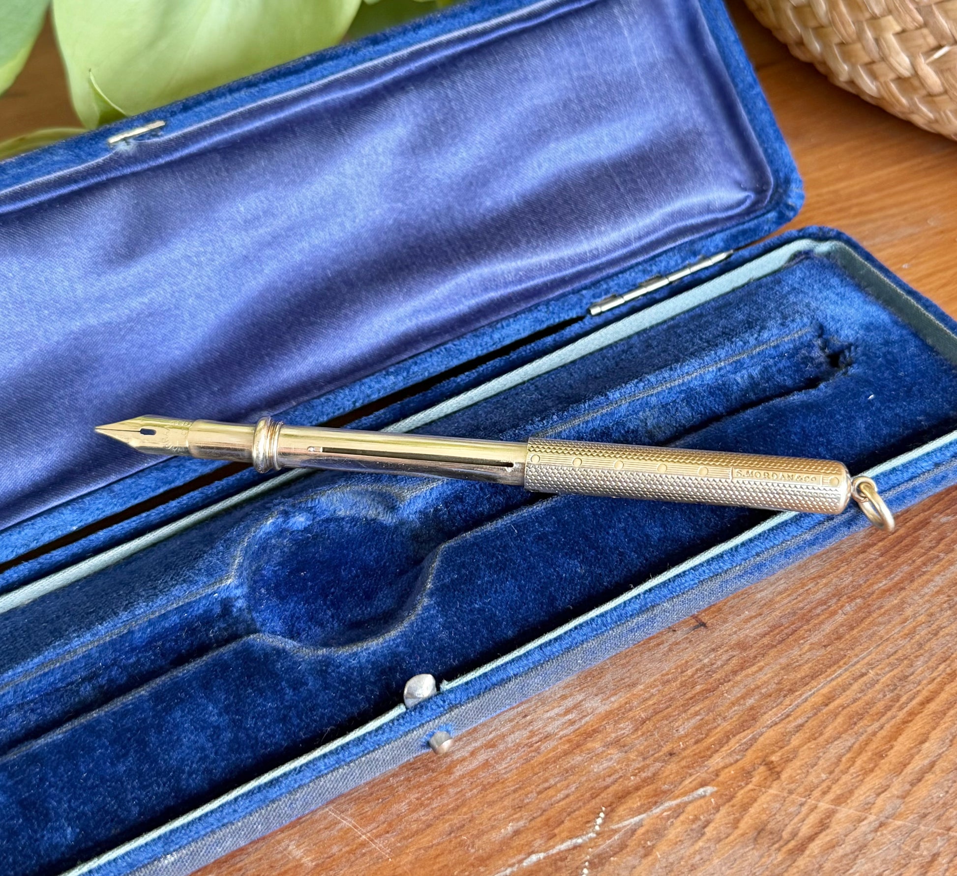 Metal: 15ct gold (confirmed via X-ray testing; item is unmarked, as is typical with many of their pieces). The dip pen nib only is marked “Warranted 14ct” and appears original to the piece.
