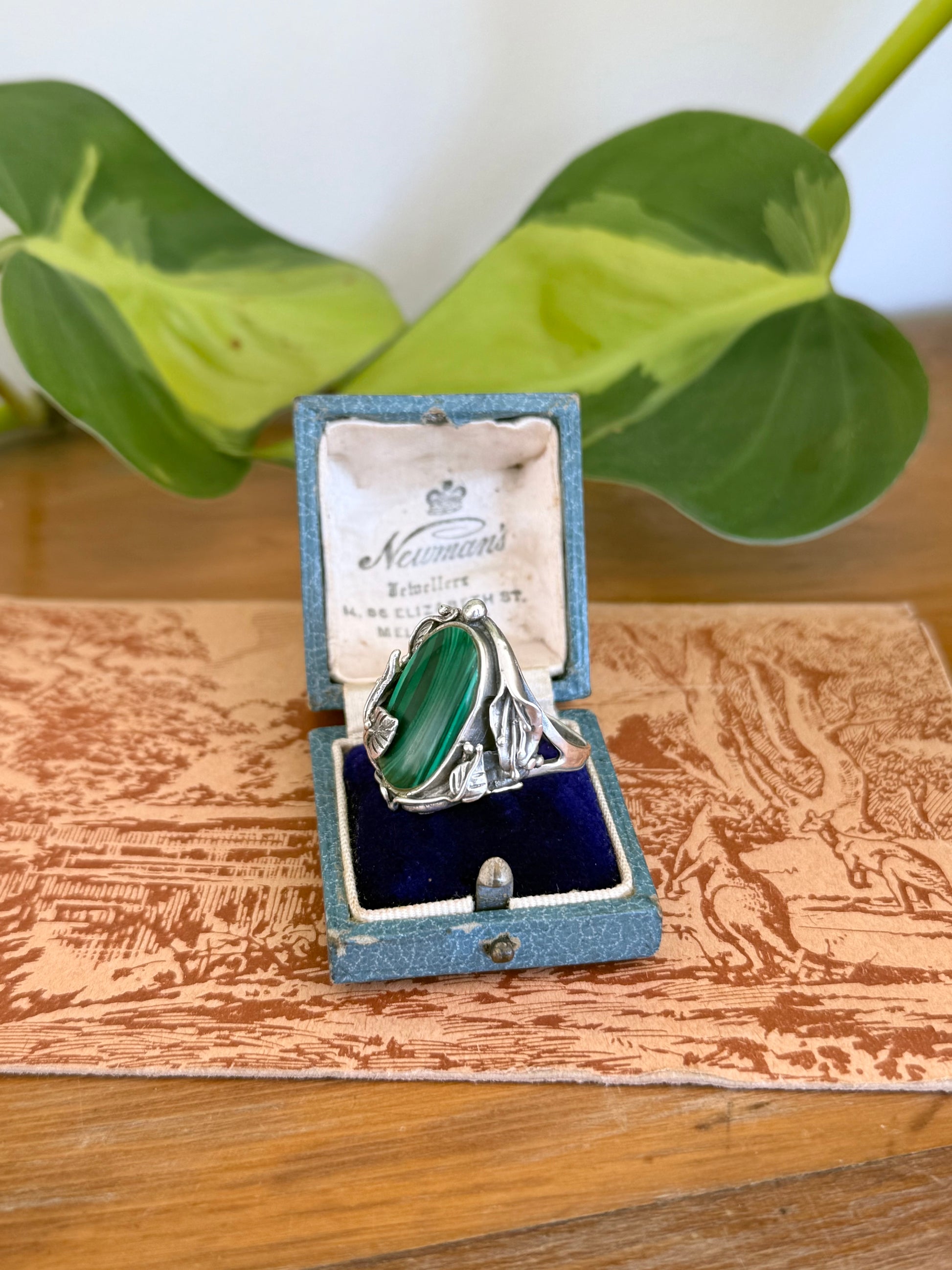 This striking malachite ring drew us in for its beautifully sculptural Art Nouveau–style design and deeply romantic floral setting. The rich green malachite is framed by flowing silver vines and delicate lily-of-the-valley blossoms — a historic European symbol of love, renewal and the return of happiness. We love how the organic silverwork appears to grow naturally around the stone, giving the ring a soft, almost magical presence on the hand. Whether worn as a statement piece or treasured for its symbolism, it’s a ring that feels both elegant and full of story.