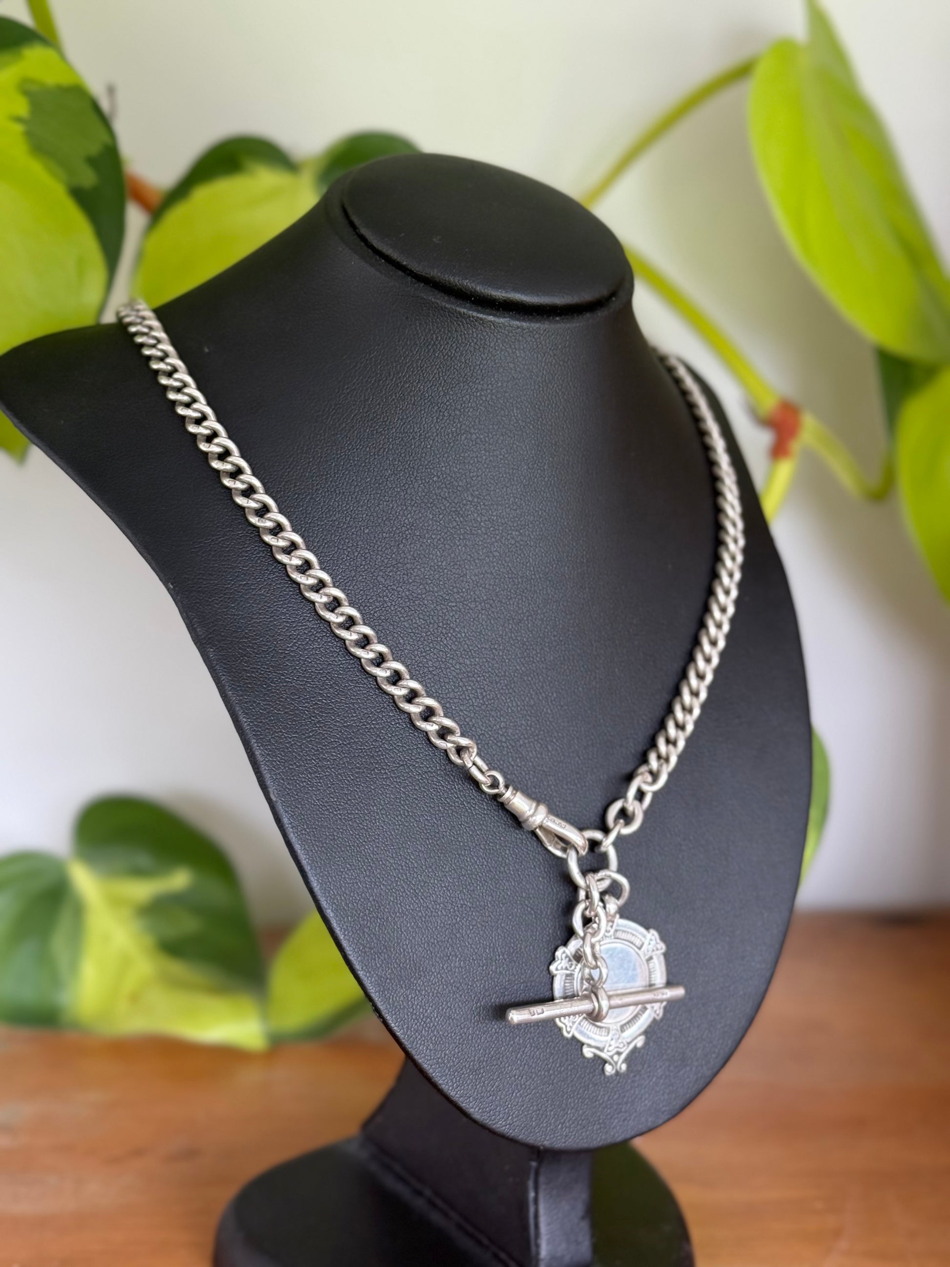 Why we chose it: This is a beautiful example of late 19th–early 20th century English sterling silver craftsmanship. Every link is hallmarked — a detail that speaks to its authenticity and quality. The generous 465mm length gives it a substantial, elegant drape, and it has a lovely feel when worn around the neck. The original medal adds charm, history, and collectability, making it a truly character-filled antique piece.