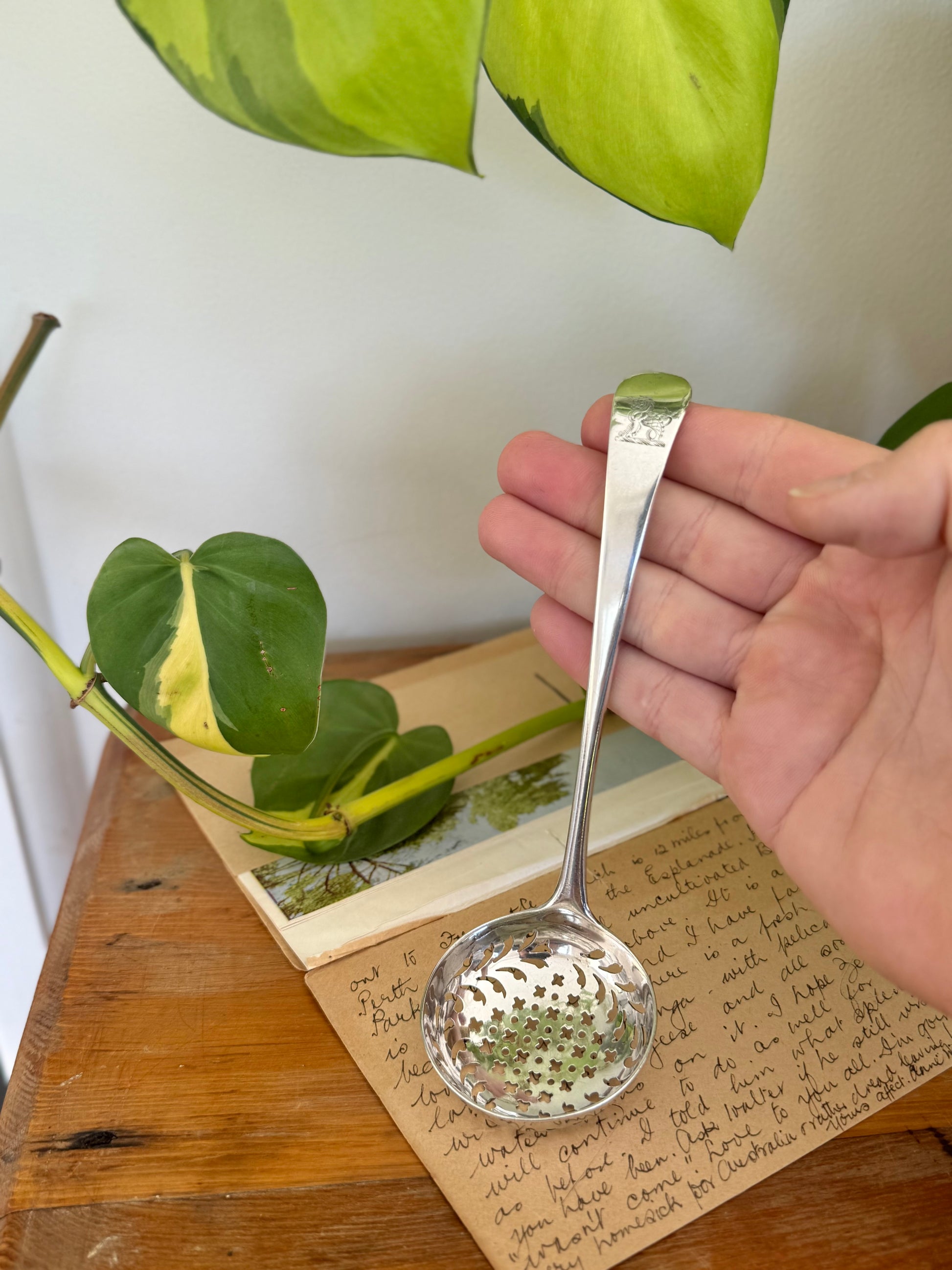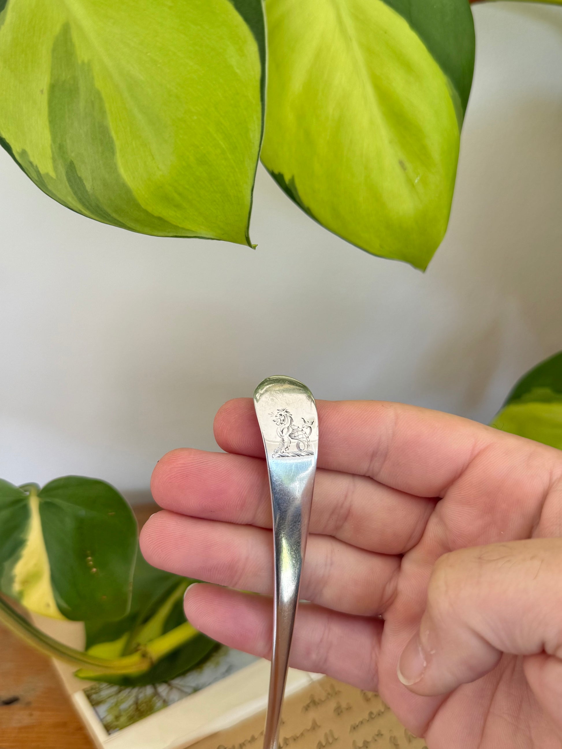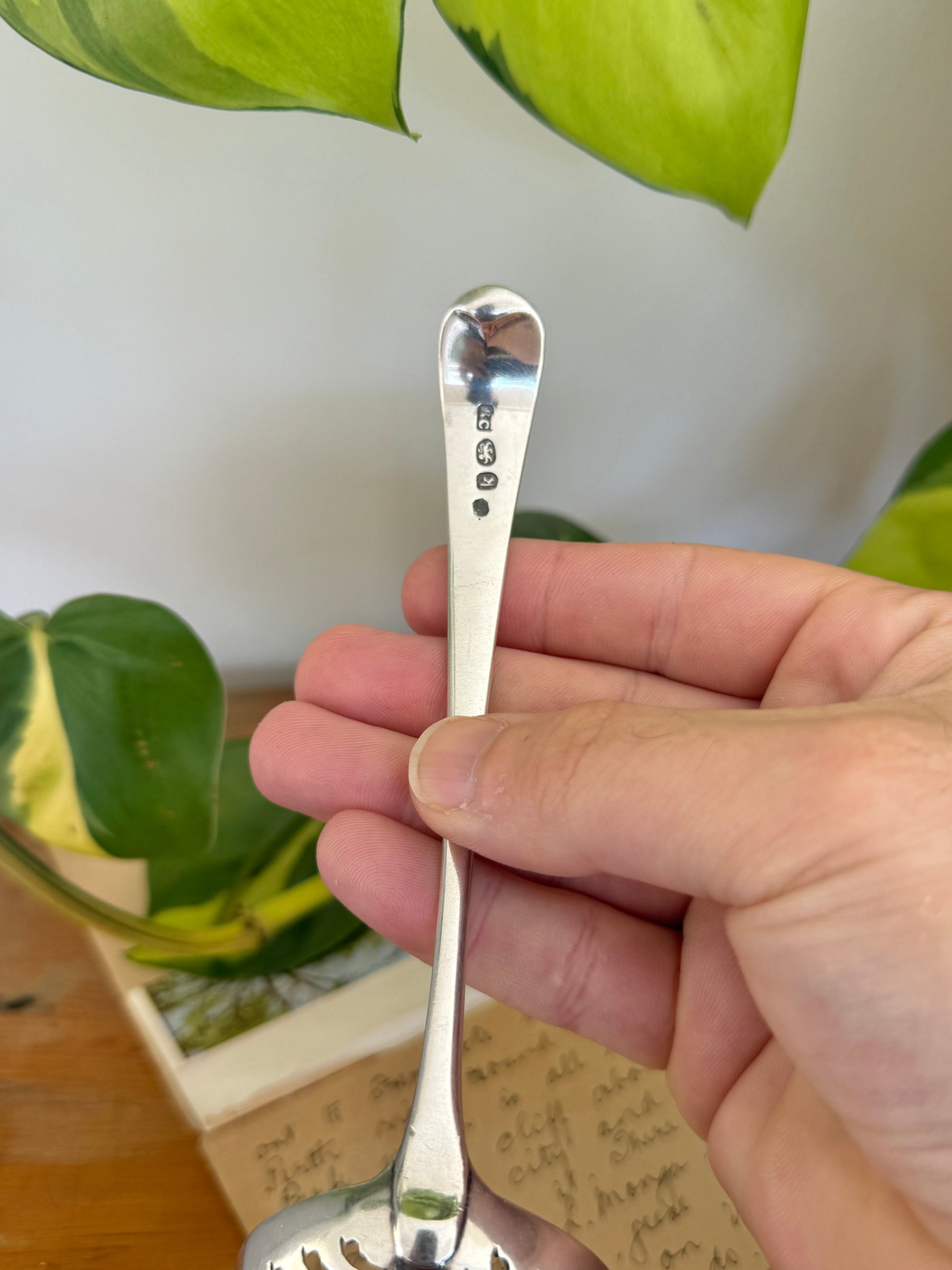 This remarkable Georgian sugar sifter immediately stood out for both its rarity and its beautifully engraved heraldic crest. The terminal is engraved with a mythical Sea-Lion — a powerful heraldic creature symbolising courage, guardianship and noble lineage — and we love how this sits so confidently within the elegant late-18th-century form of the spoon. The finely pierced bowl and slender tapering handle give it that unmistakable Georgian refinement, while the rare incuse hallmark and London maker anchor it firmly in its historic period. It’s exactly the kind of character-filled, story-rich silver we love to offer.