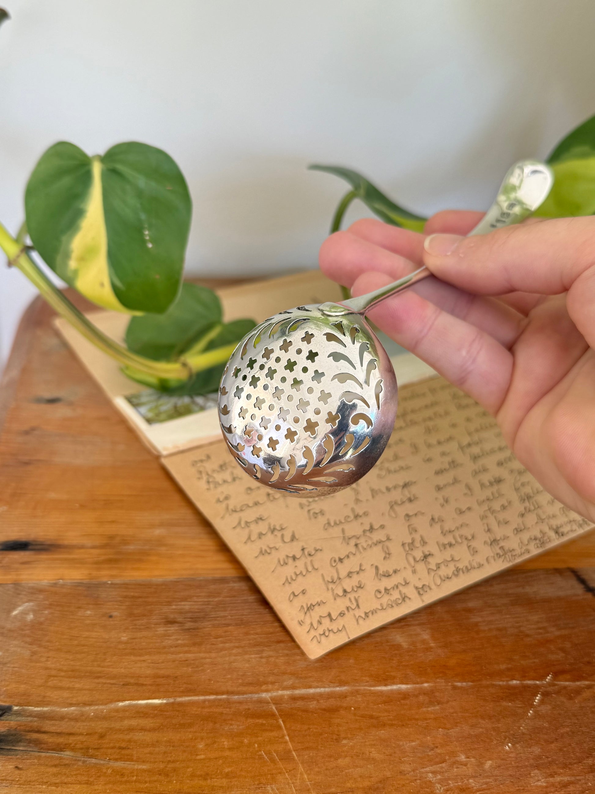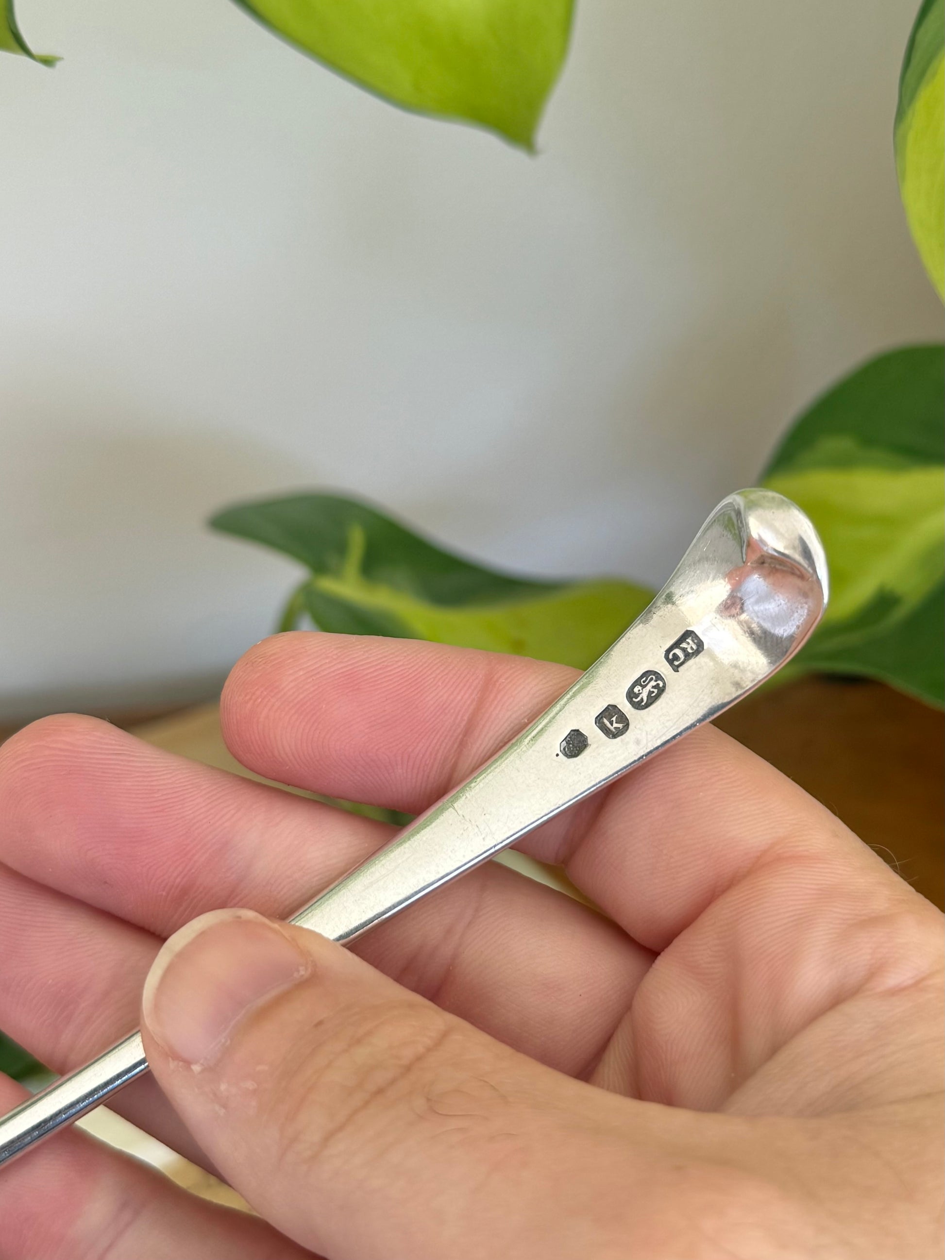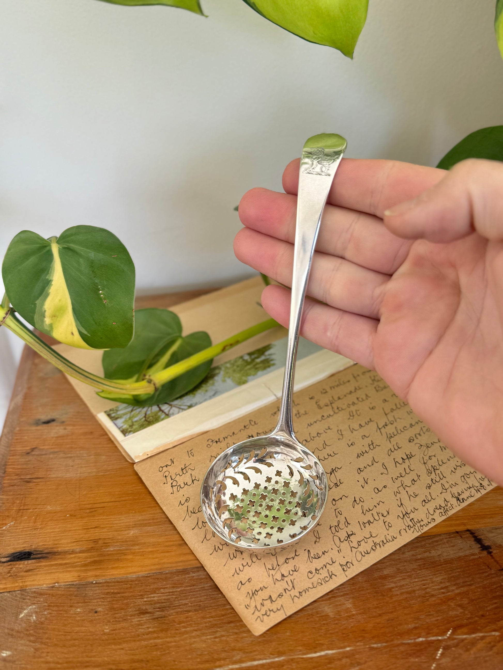 This remarkable Georgian sugar sifter immediately stood out for both its rarity and its beautifully engraved heraldic crest. The terminal is engraved with a mythical Sea-Lion — a powerful heraldic creature symbolising courage, guardianship and noble lineage — and we love how this sits so confidently within the elegant late-18th-century form of the spoon. The finely pierced bowl and slender tapering handle give it that unmistakable Georgian refinement, while the rare incuse hallmark and London maker anchor it firmly in its historic period. It’s exactly the kind of character-filled, story-rich silver we love to offer.