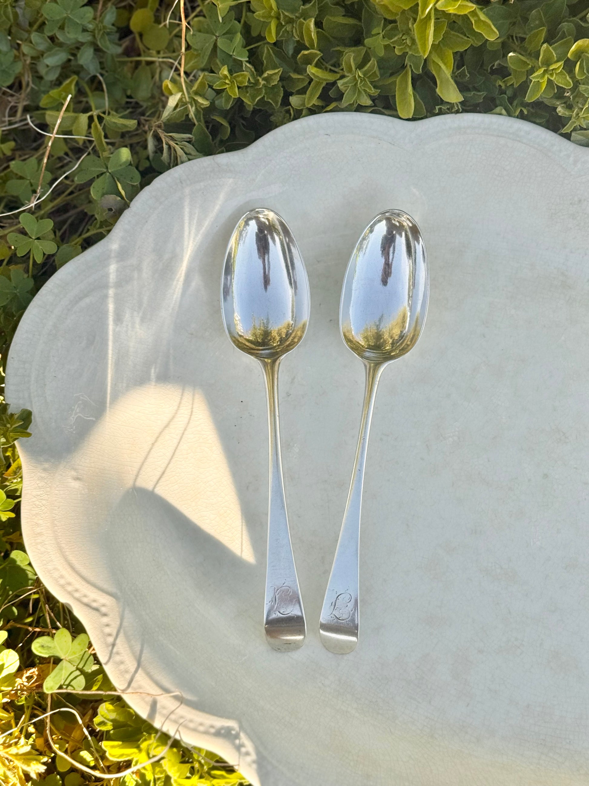 Condition: Excellent antique condition with light surface wear consistent with age. The hallmarks on both spoons are unevenly struck, but after careful consideration we are confident in the attribution to George Smith III and the 1781 date. A lovely, simple monogram is engraved on each spoon. Hallmarks remain legible. A superb example of Georgian silver.