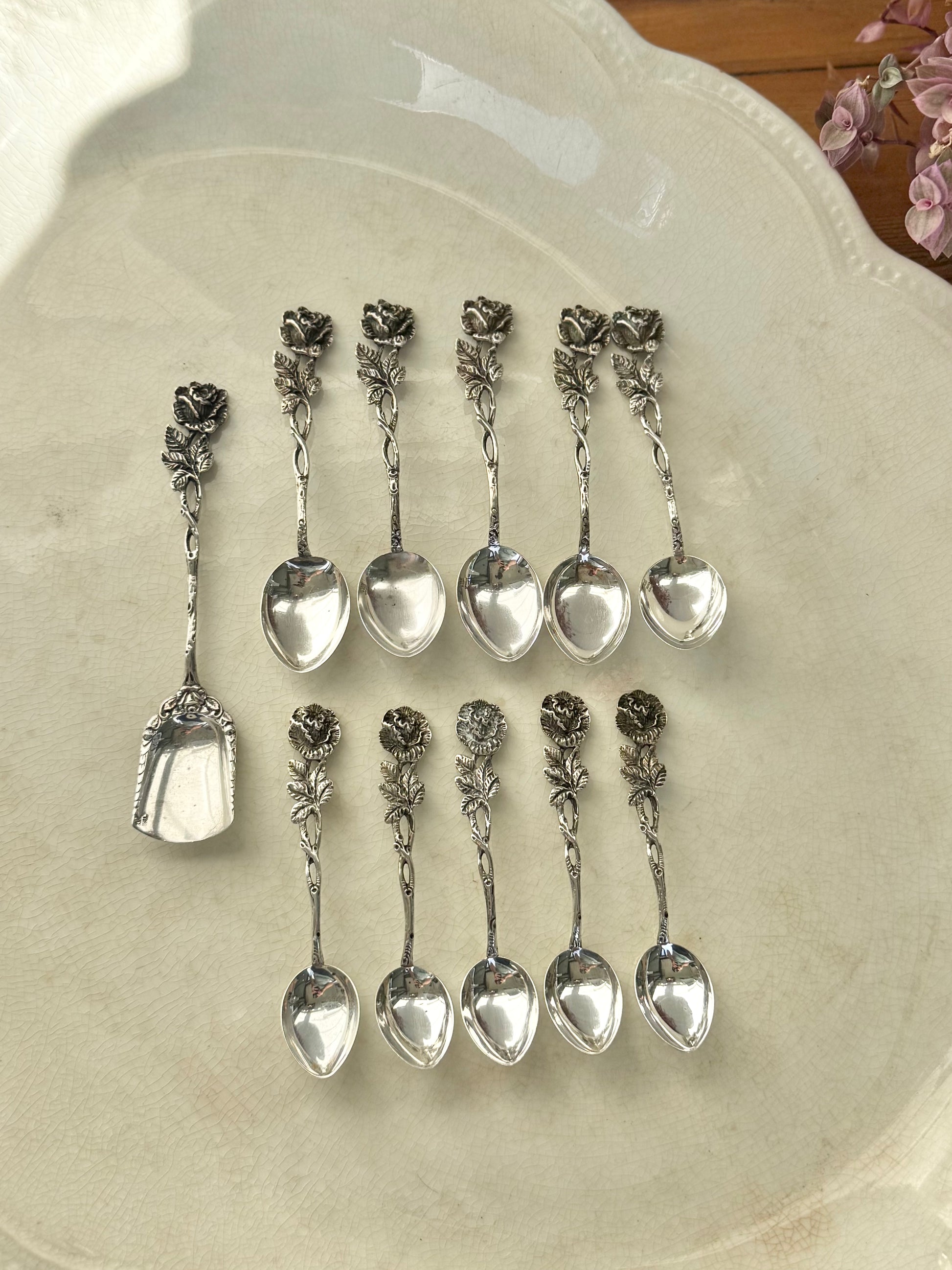 Why we chose it: A beautifully matched 11-piece German silver spoon set in the iconic Hildesheim Rose pattern. This timeless design was inspired by the legendary thousand-year-old rose bush that grows against the walls of Hildesheim Cathedral in Germany — a powerful symbol of love, beauty, and endurance. The sculptural rose, flowing branches, and leaf-shaped bowls are all designed to echo the natural form of that famous rose, giving each spoon a wonderfully romantic and story-rich presence. The fact that every piece is clearly stamped “835 Silver – Germany” speaks to the quality and authenticity of this beautiful continental silver set.