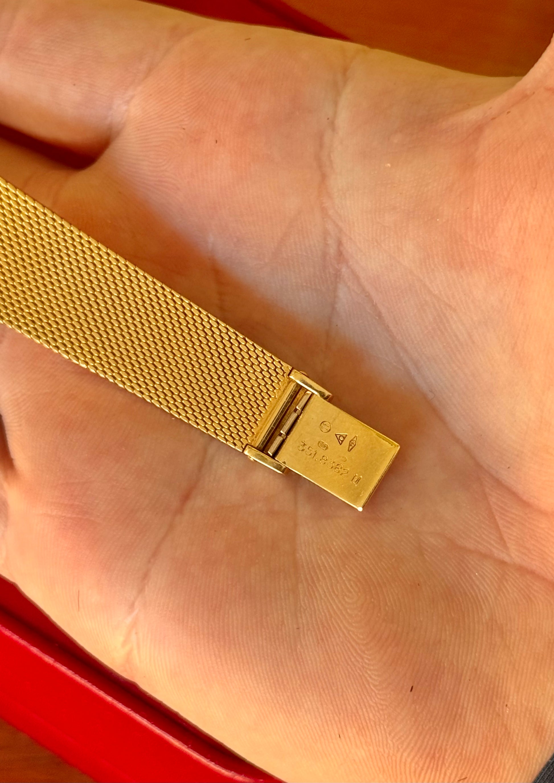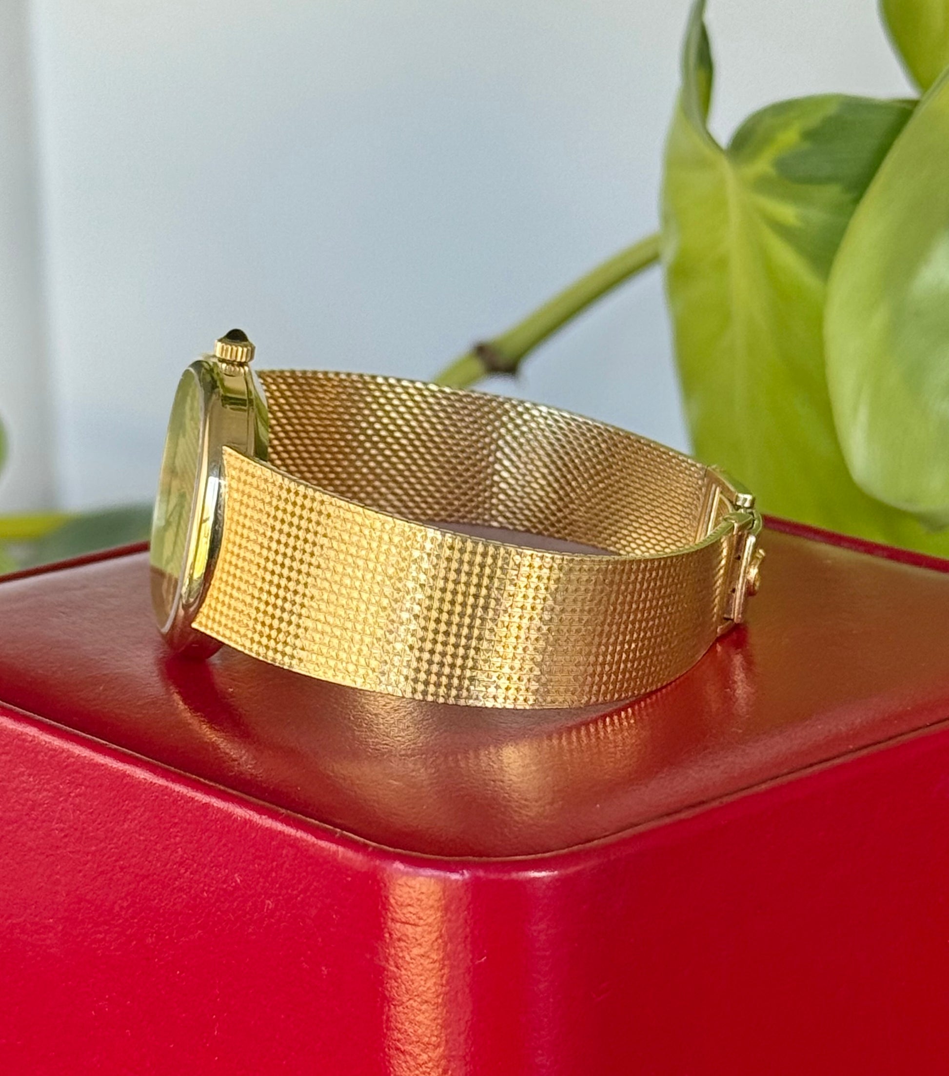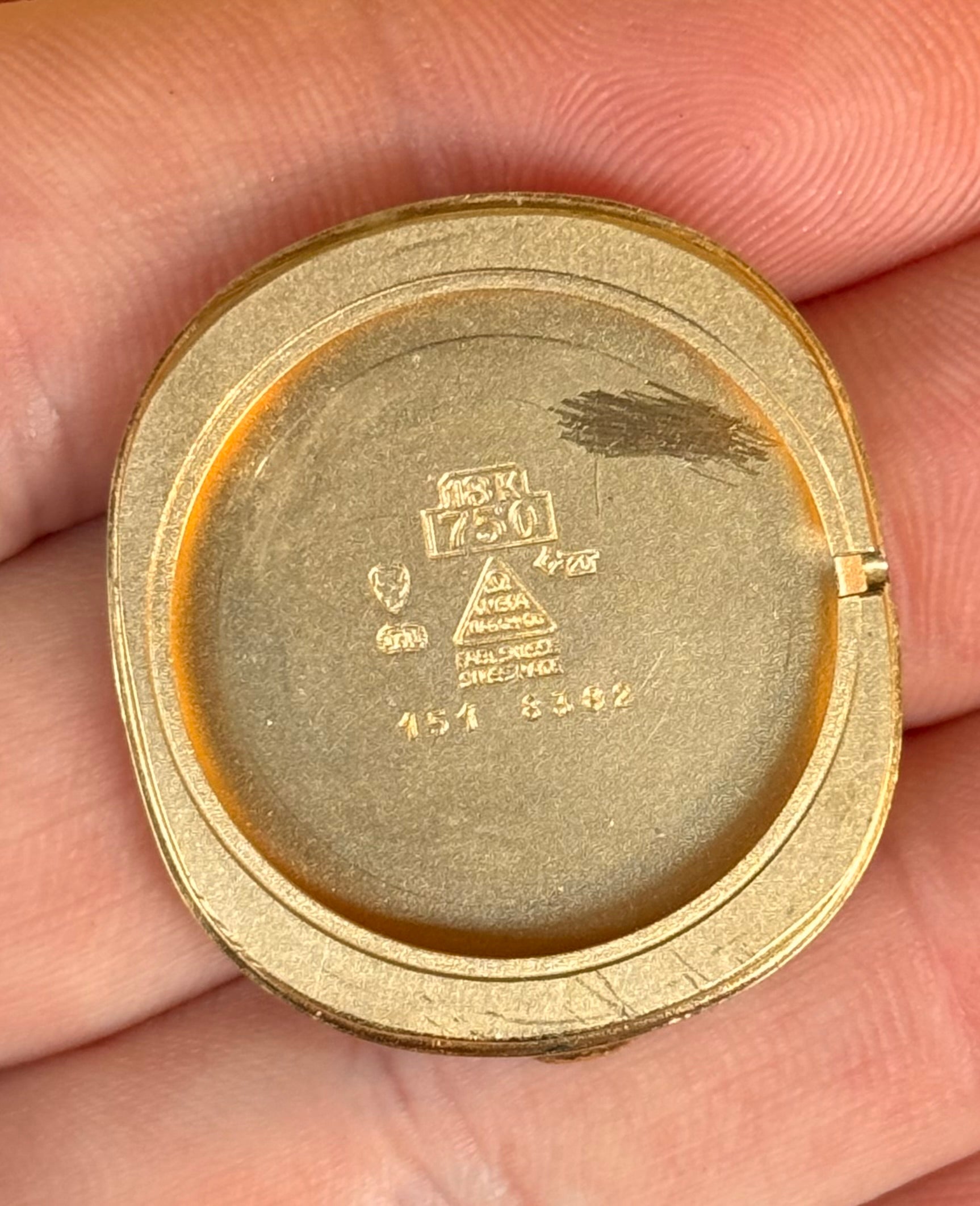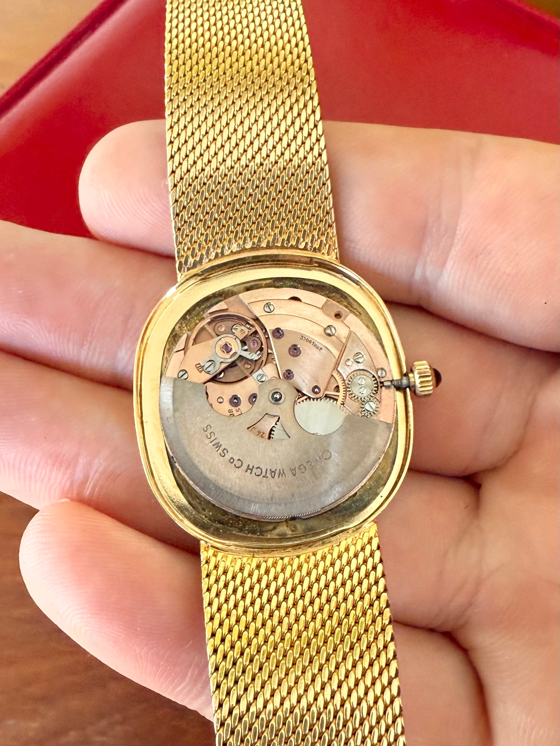Solid 18ct yellow gold — both the case and bracelet are crafted entirely from hallmarked 18ct gold, not gold-plated or capped. This is a premium example of Omega’s luxury watchmaking from the era.
