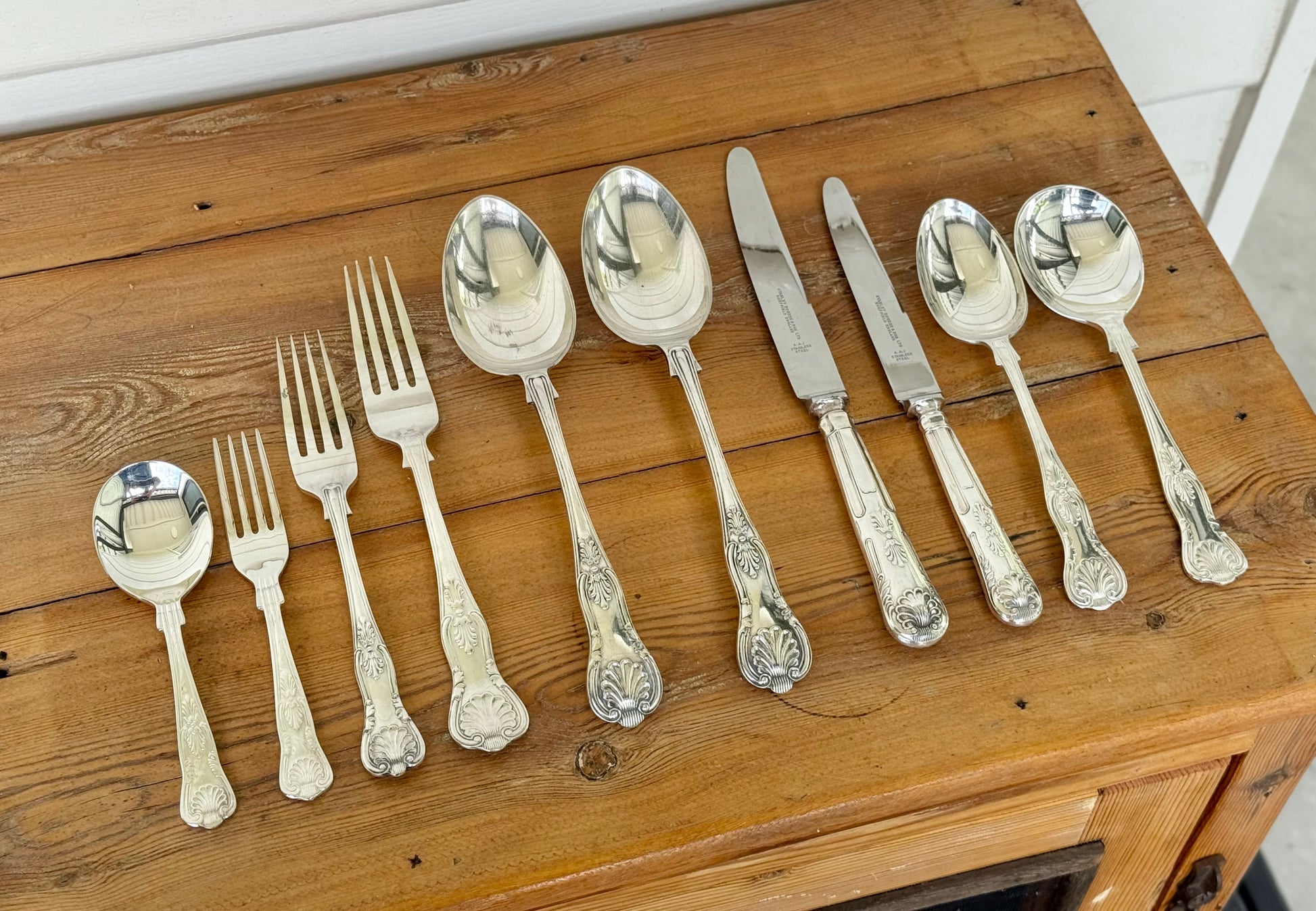 Historically, King’s pattern was reserved for grand homes and formal entertaining, becoming synonymous with celebration, legacy, and occasion. Its substantial weight and unmistakable shell terminal set it apart from simpler flatware patterns, and it was often chosen as a milestone purchase — wedding gifts, formal services, and sets intended to be passed down through generations.