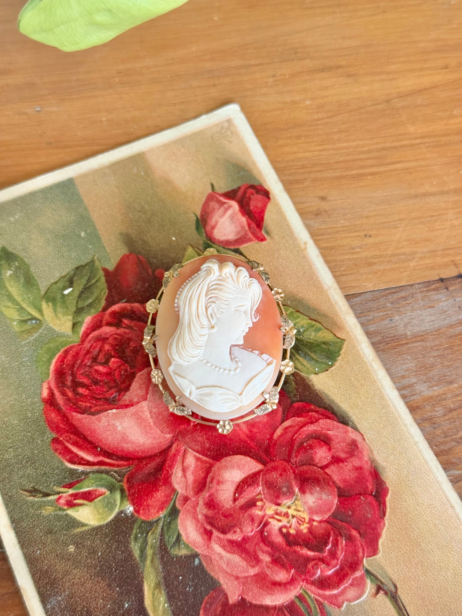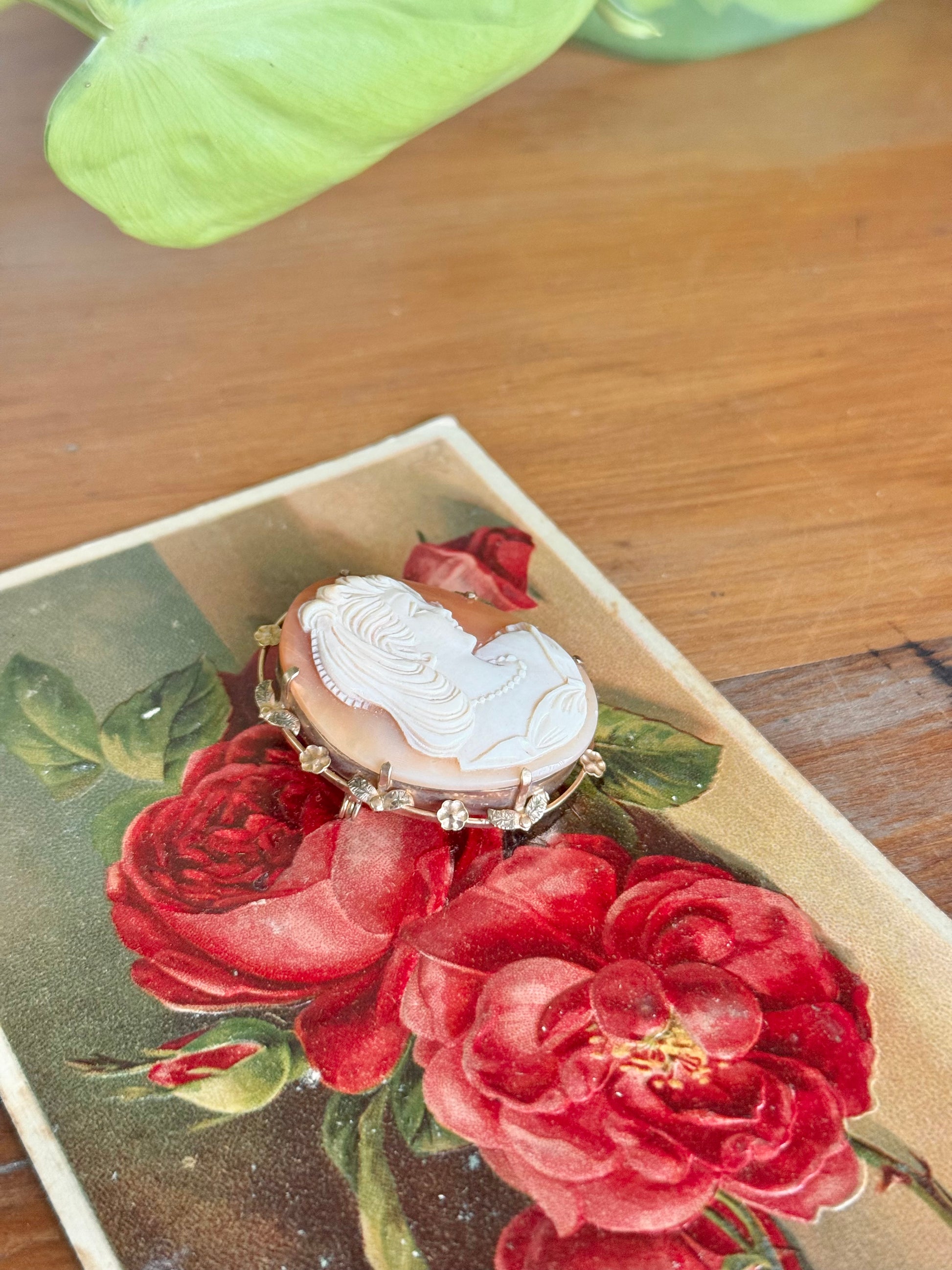 Product: Shell cameo brooch with floral gold frame