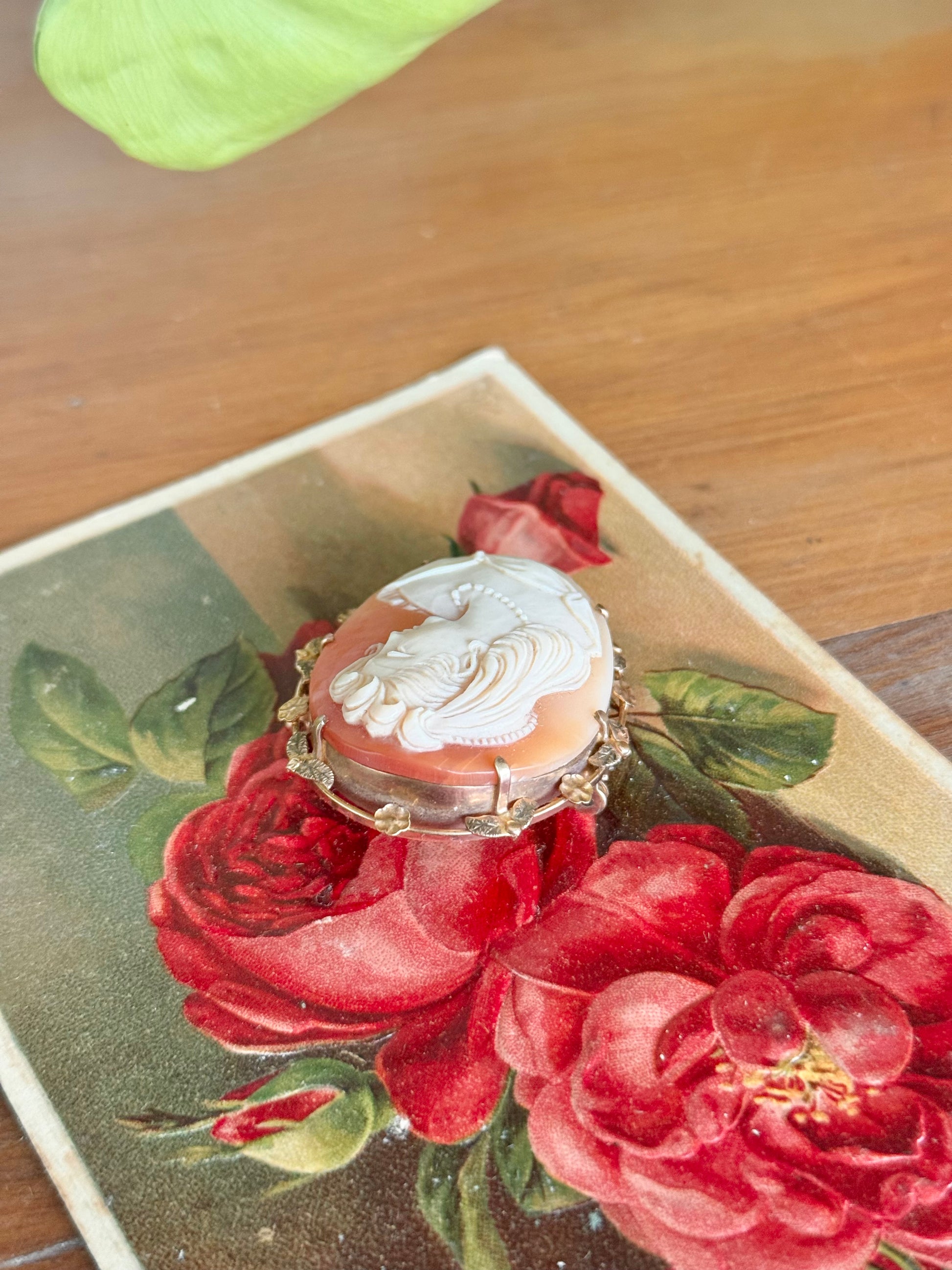 9ct Gold Shell Cameo Brooch | Ornate Floral Frame | Mid 20th Century
