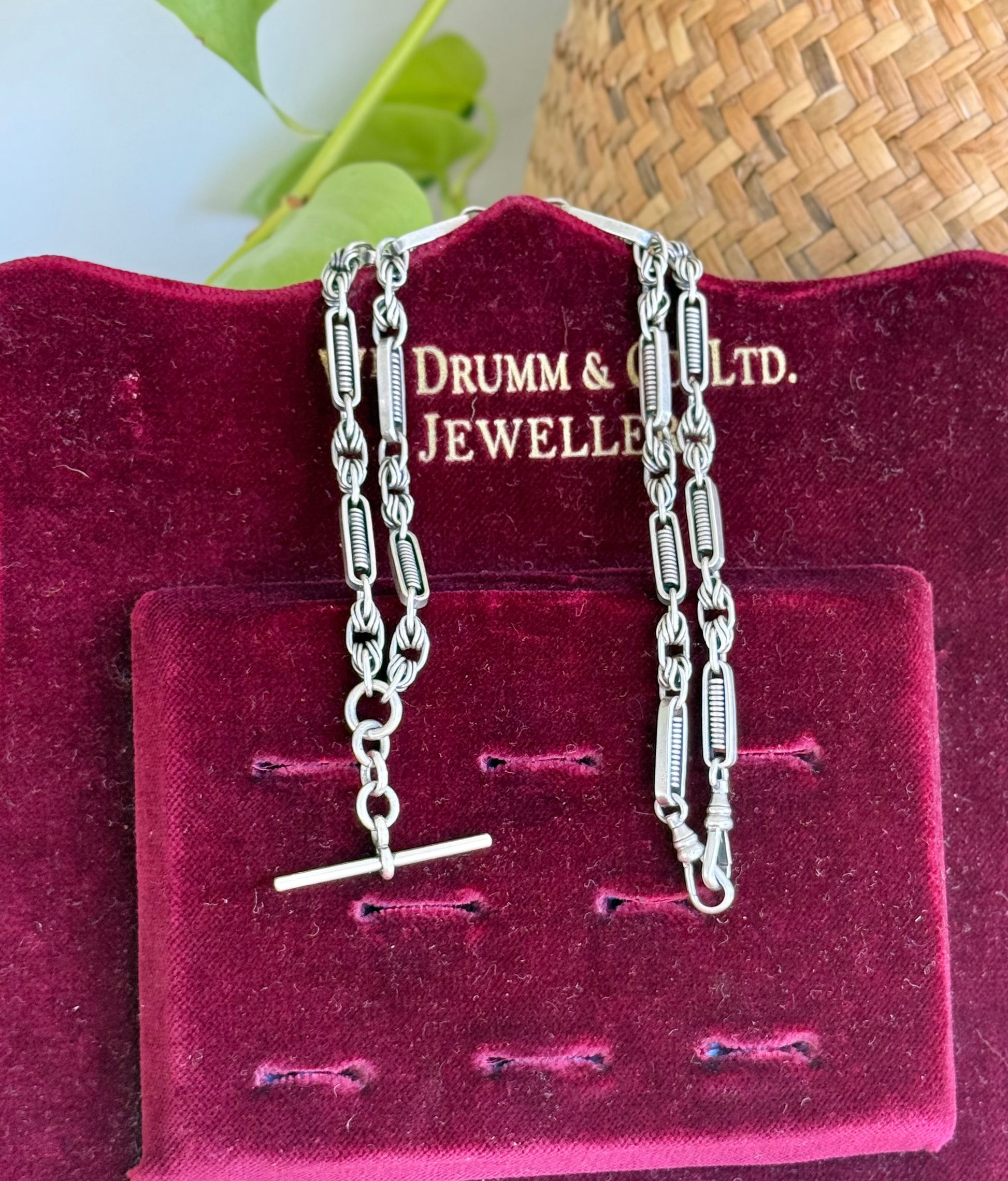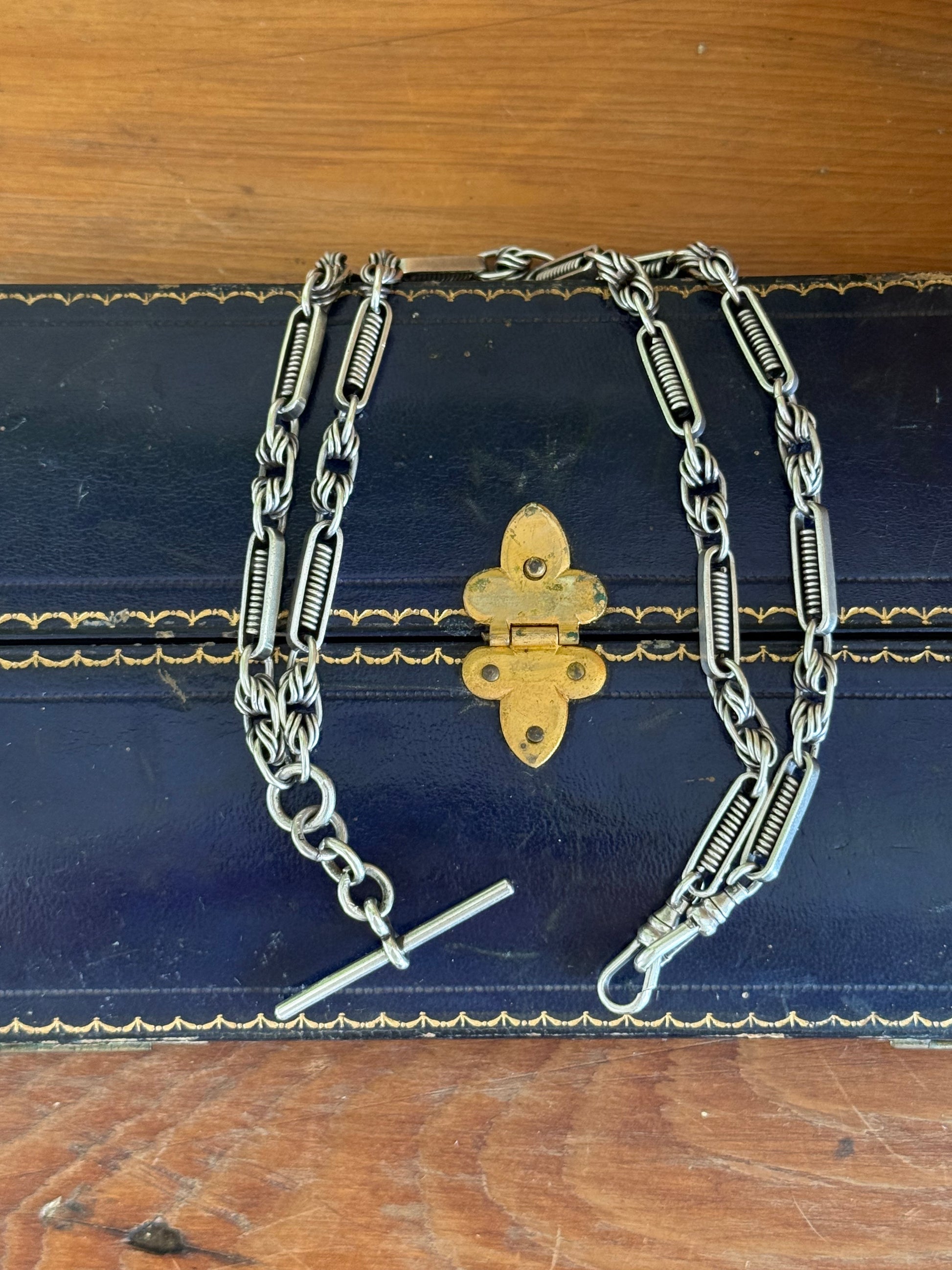 Why we chose it: A substantial and beautifully crafted example of an early 20th century Australian sterling silver fob chain. This piece combines an elegant twisted fancy link with elongated oval links featuring an unusual coiled detail within each link—an eye-catching design not commonly seen in standard curb chains. Its generous length sets it apart from shorter Albert chains of the era, offering versatility to wear alone or to display a cherished pendant or fob.