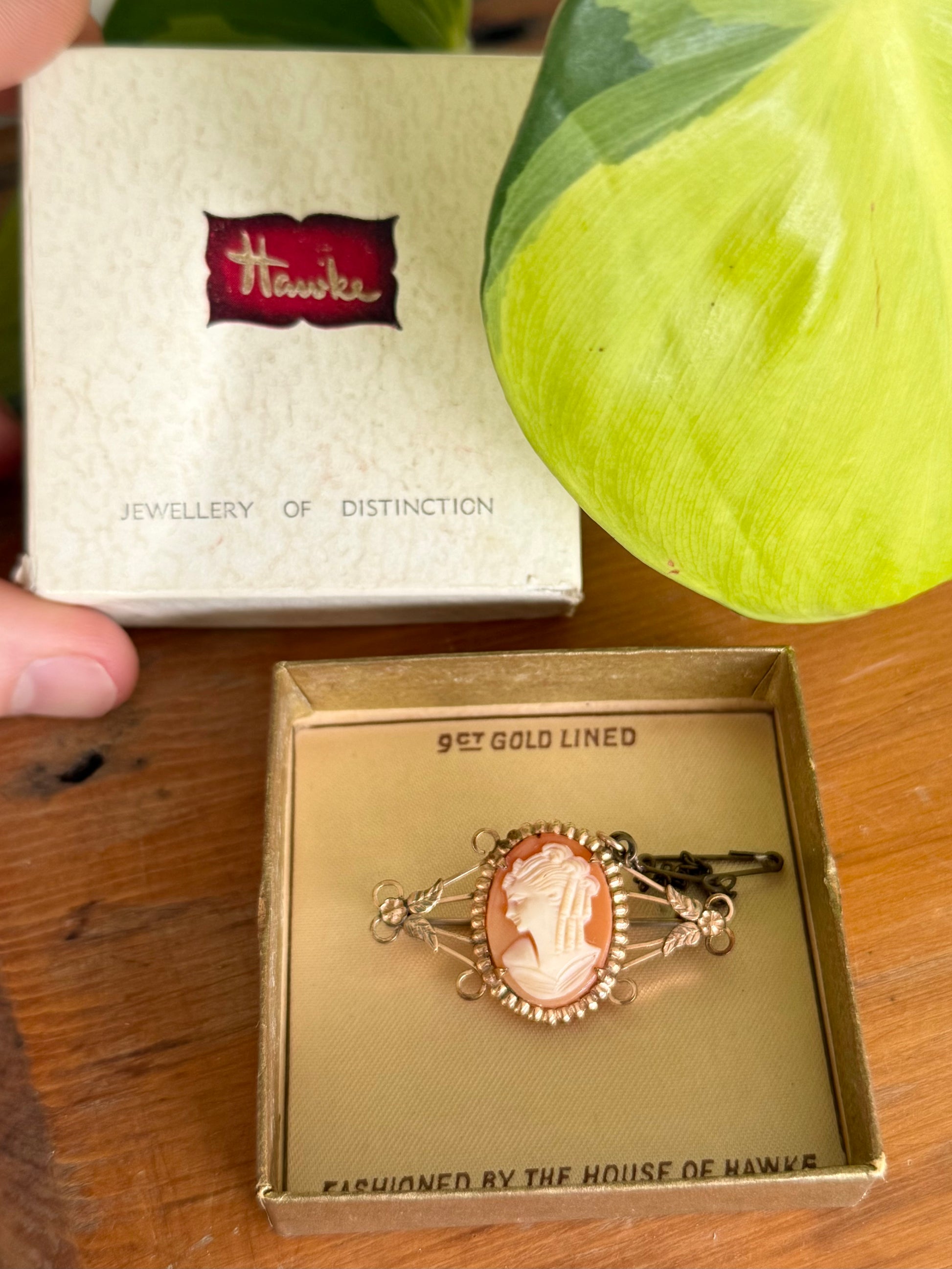 Vintage Australian Hawke 9ct Gold-Lined Carved Shell Cameo Brooch with Original Box