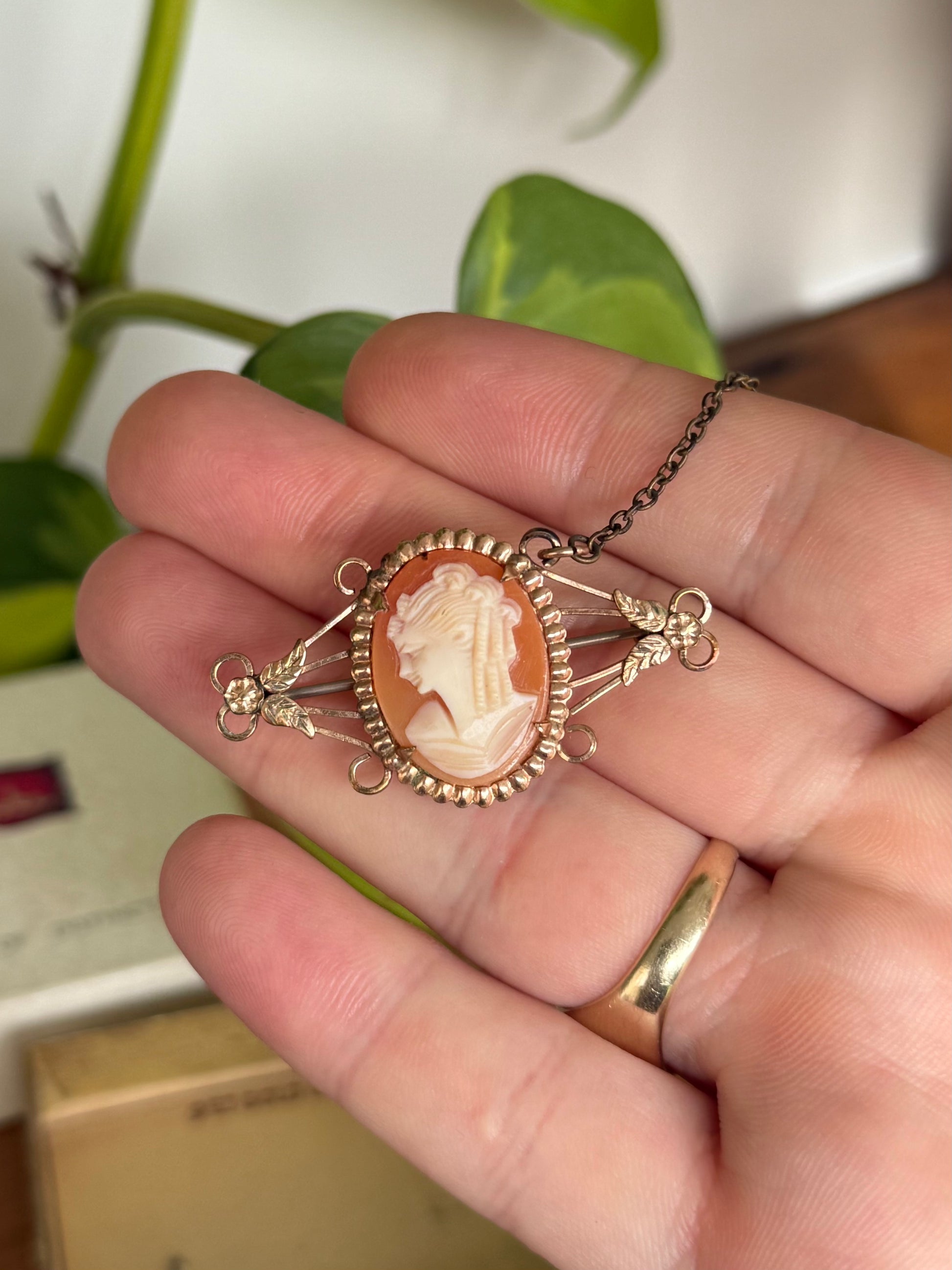 Product: 9ct gold-lined carved shell cameo brooch with original box