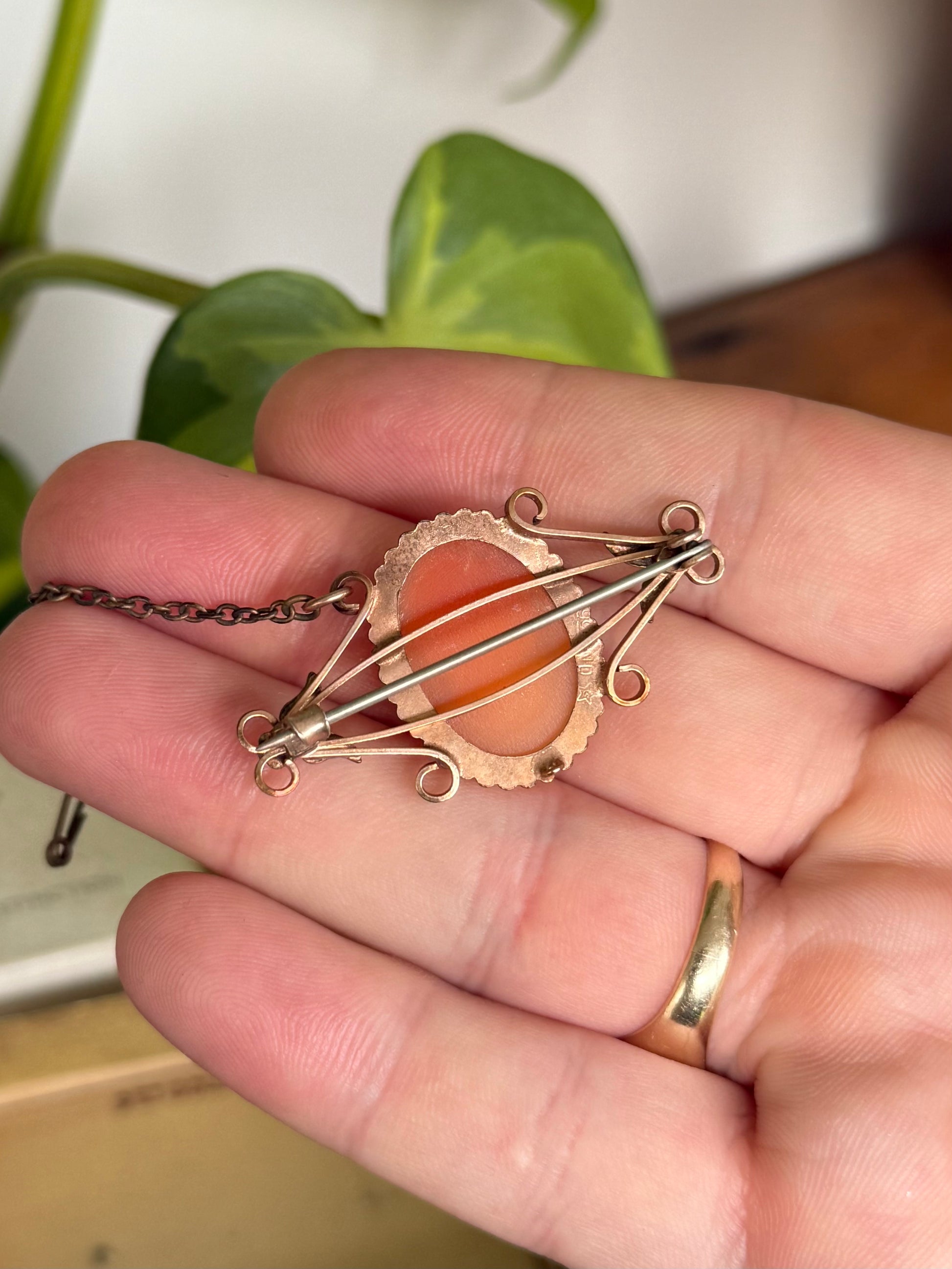 Why we chose it: A beautifully preserved Australian cameo brooch by Hawke, complete with its original presentation box — a rare and wonderful touch for collectors. The cameo itself is hand-carved from natural shell, displaying elegant detail and warm contrast. We love the classic 9ct gold-lined setting, which adds richness while keeping the brooch lightweight and wearable. The small natural fault at the top of the cameo shell does not detract from its beauty and may even have occurred during carving. A charming and authentic heirloom piece.